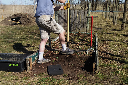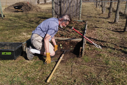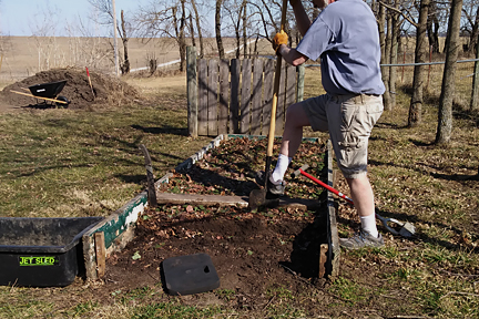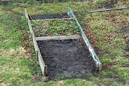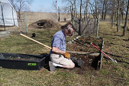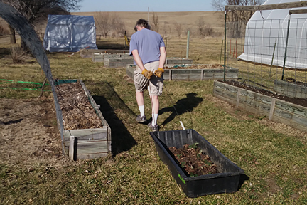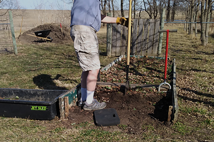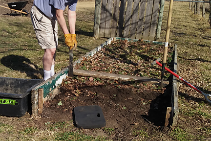 Luckily, the new raised beds had compressed about five inches below the edge of the top board as well. Wouldn't it be great if we could just sliced through the soil below the plants and shift them with the soil to the new beds?