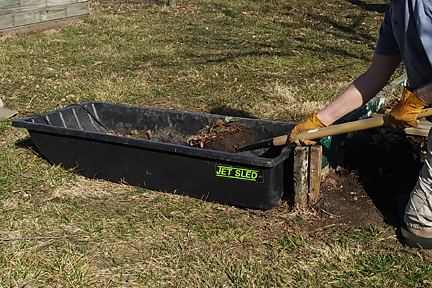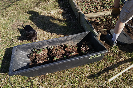 When either the sled was full, the row completely moved into the sled, or the sled was really heavy (but not enough that it would hurt me), I would haul the sled over to the new bed and once again place/press the slices of soil/plants into the watered-in soil of the new bed.